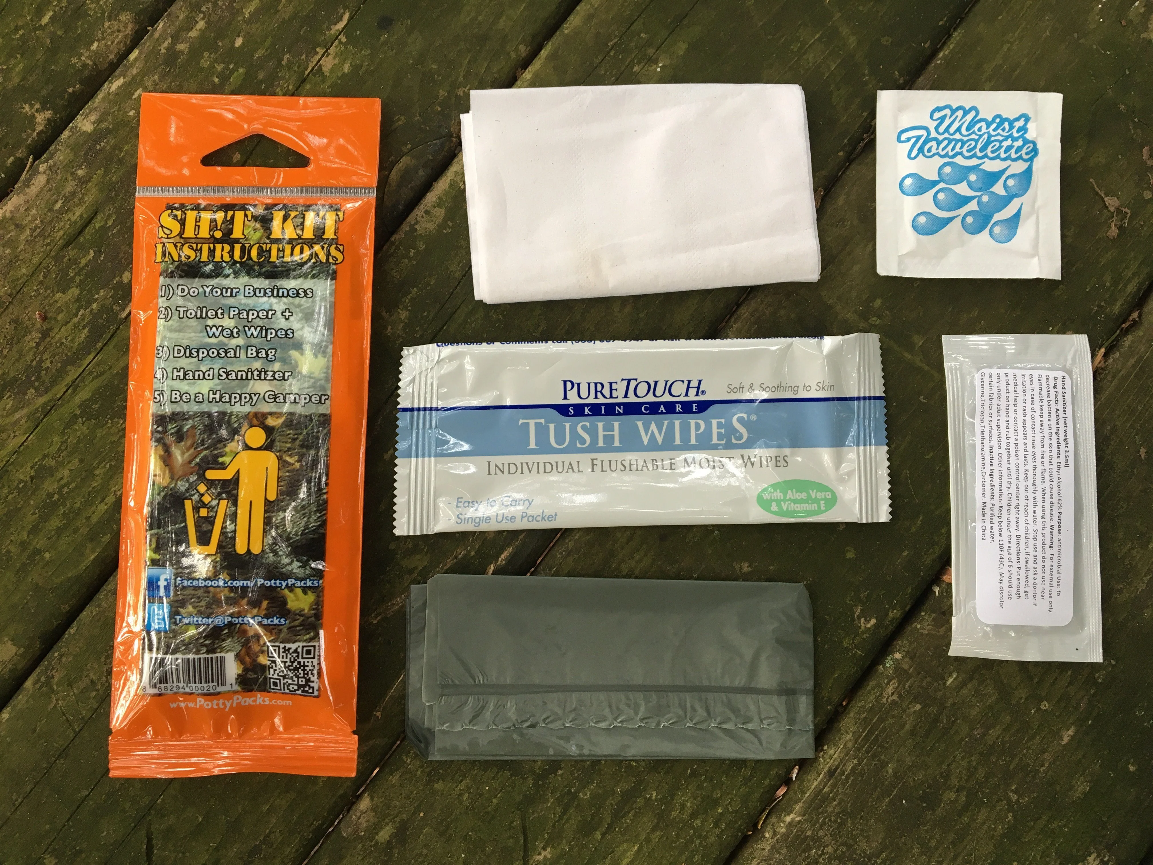 Included are 4 feet of two-ply toilet paper and wet wipes. The wet wipes are made with Vitamin E and Aloe Vera. Follow up by cleaning your hands with the sanitizer lotion and hand wipes. The disposal bag can be used to not to leave any trace behind.