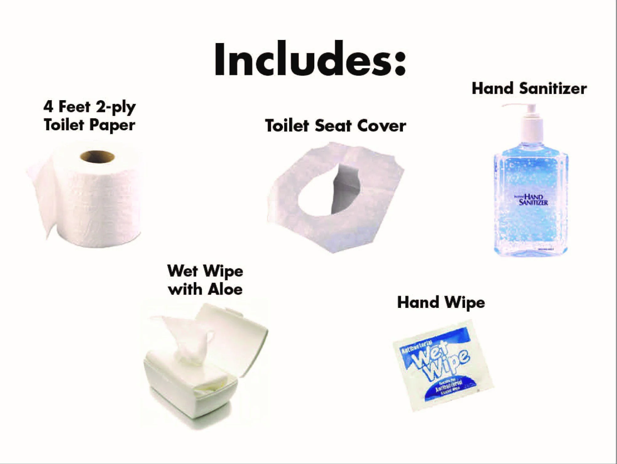 Made by Potty Packs. This travel toilet pack includes everything but the toilet. Included are a seat cover, 4 feet of two-ply toilet paper and wet wipes. The wet wipes are made with Vitamin E and Aloe Vera. Follow up by cleaning your hands with the sanitizer lotion and hand wipes.